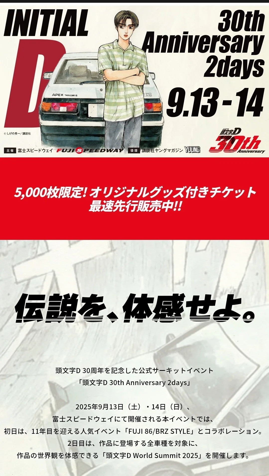 "Initial D 30th Anniversary" is an official circuit event celebrating the 30th anniversary of Initial D. This event experience will includes attending the second day held at Fuji Speedway on Sunday, September 14th, 2025. On this day, "Initial D World Summit 2025" will be held, where you can experience the world of the work with all the cars that appear in the manga series.