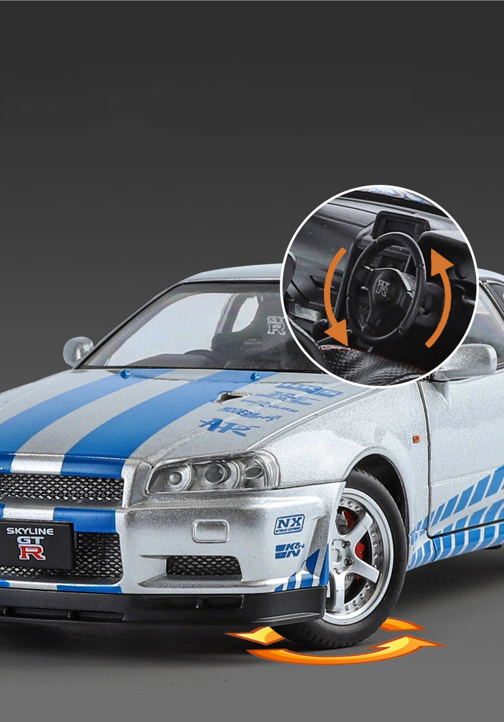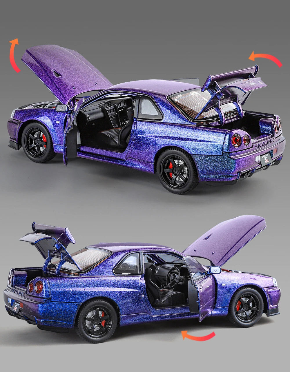 Experience an icon of JDM tuning culture with this 1:24 Nissan GTR R34 Skyline Alloy Model Car. Crafted from die cast alloy, it showcases detailing true to the iconic R34 design at an affordable price. Perfect for collectors and enthusiasts seeking a high-quality replica that embodies the engineering excellence and performance heritage of this legendary Skyline model.